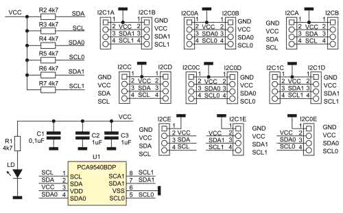 Magistrala I2C doprowadzona jest do wyprowadzeń SCL/SDA, a z multipleksera wyprowadzona jest na dwie grupy złączy I2C0 A...E i I2C1 A...E. Dioda LD sygnalizuje obecność zasilania, rezystory R2...R7 podciągają wstępnie magistralę I2C, ich wartość można zoptymalizować w zależności od docelowego napięcia zasilania układu. Układ PCA9540B widoczny jest na magistrali pod adresem 0x70 i ma tylko jeden rejestr kontrolny, który można odczytywać i zapisywać. Domyślnie po włączeniu zasilania obie magistrale są odłączone i w rejestrze inicjowana jest wartość 0x00, zapis wartości 0x04 wybiera magistralę I2C0, zapis 0x05 magistralę I2C1, zapis pozostałych wartości wyłącza obie magistrale.