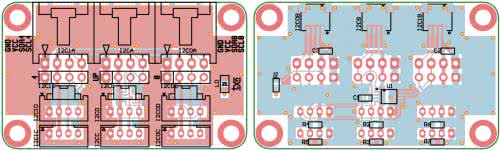 Moduł zmontowany jest na dwustronnej płytce drukowanej, której schemat został pokazany na rysunku 3. Sposób montażu jest klasyczny i nie wymaga opisu.