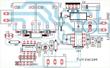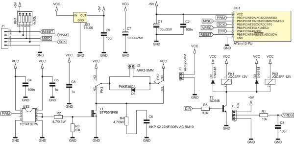 Cewki przekaźników PK1 i PK2 nie wymagają szczególnego sterowania. Wystarczy zwykły klucz na niemal dowolnym tranzystorze bipolarnym jak BC546, aby mikrokontroler mógł je załączać. Diody zabezpieczające, D2 i D3, zostały umieszczone przy każdej cewce przekaźnika, aby długość drogi prądu wynikającego z samoindukcji była możliwie krótka.
