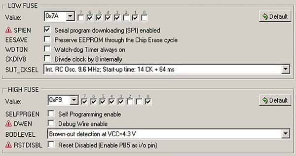 W ramach czynności uruchomieniowych należy ustawić bity zabezpieczające mikrokontrolera ATtiny13 na wartosci: Low Fuse = 0x7A, High Fuse = 0xF9. Spowoduje to wyłączenie wbudowanego dzielnika częstotliwości sygnału zegarowego przez 8 oraz uruchomienie obwodu Brown-Out Detector, który będzie monitorował napięcie zasilające mikrokontroler i wyłączy go, jeżeli napięcie zasilania spadnie poniżej 4,3 V. Szczegóły znajdują się na rysunku 4. Trzeba również zaprogramować pamięć Flash dostarczonym wsadem w postaci pliku hex.