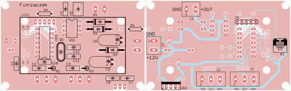 Układ został zmontowany na dwustronnej płytce drukowanej o wymiarach 80×50 mm. Jej schemat został pokazany na rysunku 2. W odległości 3 mm od krawędzi płytki znalazły się otwory montażowe, każdy o średnicy 3,2 mm.