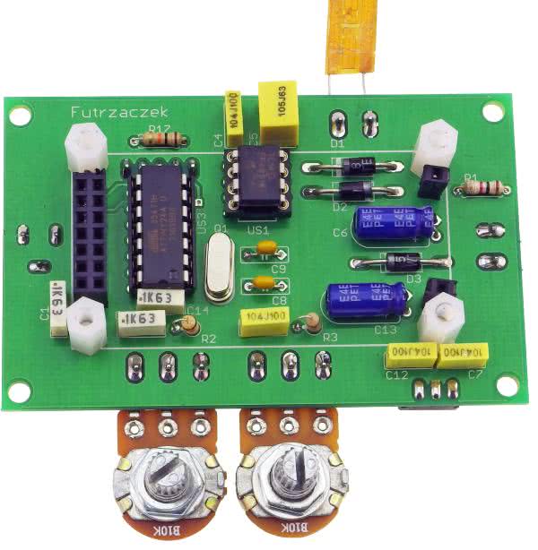 Do złączy J1 i J2 należy podłączyć potencjometry służące do ustawiania częstotliwości błysków. Można je przykręcić wprost do złączy, jak to uczyniono w układzie modelowym, lub można też dołączyć za pomocą przewodów. Rezystancja ścieżki nie musi wynosić dokładnie 10 kΩ, ponieważ służą jedynie jako dzielniki napięcia. Nawet nie muszą być identyczne. Można przyjąć, że zakres rezystancji 2…100 kΩ jest jak najbardziej optymalny. Wtedy pobór prądu ze stabilizatora nie będzie zbyt wysoki, a jednocześnie rezystancja wewnętrzna takiego dzielnika będzie na tyle niska, że układ będzie miał małą wrażliwość na zakłócenia pochodzące z zewnątrz.