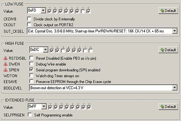 Na etapie uruchamiania konieczne jest zaprogramowanie pamięci programu mikrokontrolera dostarczonym wsadem oraz zmiana jego bitów zabezpieczających na wartości: Low Fuse = 0xFD, High Fuse = 0xDC. Szczegóły zostały pokazane na rysunku 3 – jest to okno konfiguracji tych bitów w programie BitBurner. W ten sposób zostanie uruchomiony generator dla rezonatora kwarcowego oraz Brown-Out Detector, który wprowadzi mikrokontroler w stan zerowania, jeżeli jego napięcie zasilające spadnie poniżej 4,3 V. To znacznie zmniejsza ryzyko nieprawidłowego uruchomienia układu.