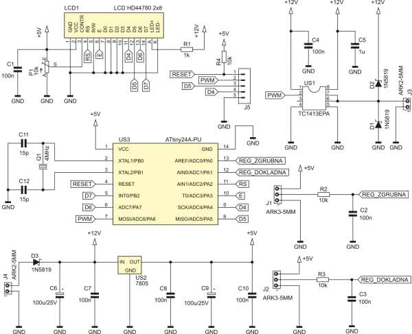 Wejściem zasilania układu jest złącze J4. Dioda D3 chroni układ przed uszkodzeniem w razie odwrotnego podłączenia biegunów źródła zasilającego. Stabilizator US2 jest klasycznym stabilizatorem liniowym, ponieważ pobór prądu przez układy cyfrowe zasilane z jego wyjścia jest na tyle niski, że użycie przetwornicy impulsowej mijałoby się z celem. Jednocześnie obudowa typu TO220 zapewnia skuteczne rozpraszanie wydzielanego ciepła i dodatkowy radiator nie jest wymagany.