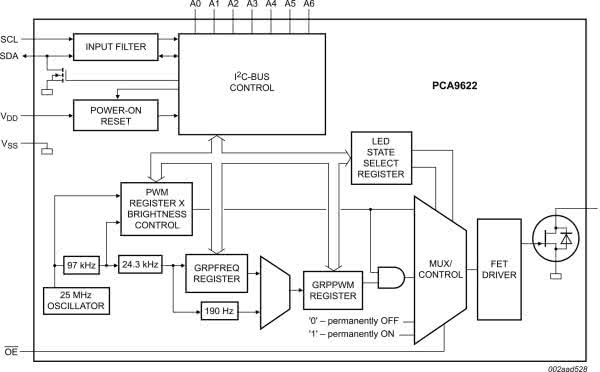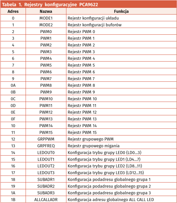Sercem modułu jest układ PCA9622, strukturę wewnętrzną układu przedstawiono na rysunku 1. PCA9622 wchodzi w skład szerokiej rodziny kontrolerów LED I2C firmy NXP. Jest to konfigurowany przez I2C 16-kanałowy generator PWM. Układ ma możliwość zewnętrznego adresowania wyprowadzeniami A0...A6. Dostępne jest 126 adresów I2C, a kilka adresów magistrali jest zarezerwowane dla sterowania globalnego.