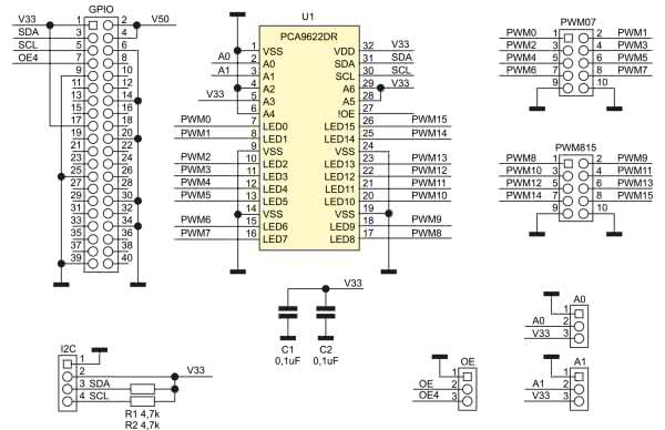 Schemat układu został pokazany na rysunku 2. Każde z wyjść może zostać ustawione w stan GND/OD. Wewnętrzny oscylator i programowane dzielniki upraszczają aplikację PCA9622. Układ ma wejście sprzętowe !OE umożliwiające sterowanie buforem wyjściowym podłączone poprzez zworę OE do GPIO4 Raspberry Pi (zwarte wyprowadzenia 2–3). Wejście może zostać podłączone także na stałe do masy (zwarte wyprowadzenia 1–2), aktywując trwale bufory wyjściowe.