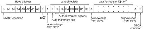 Strukturę rejestrów konfiguracyjnych zestawiono w tabeli 1. W zależności od potrzeb możliwa jest komunikacja z poszczególnymi rejestrami poprzez adresowanie indywidualne rejestrów, wskazujące na konkretny rejestr, zgodnie z rysunkiem 3. Drugim sposobem jest adresowanie grupowe wszystkich rejestrów pokazane na rysunku 4.