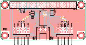 Zwory A0, A1 umożliwiają wybór czterech adresów z zakresu 0x68...0x6C. Złącze I2C jest zgodne z Grove 3,3 V i ułatwia podłączenie modułów zewnętrznych. Wyjścia PWM pogrupowane są w dwie 8-bitowe sekcje i wyprowadzone na złącza szpilkowe PWM0...7, PWM8...15.