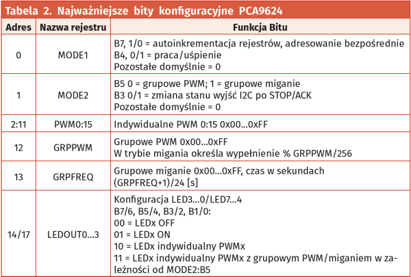Odczyt odbywa się podobnie. Dokładniejsze informacje oczywiście zamieszczone są w nocie katalogowej. Najważniejsze bity konfiguracyjne dla podstawowego trybu pracy zestawiono w tabeli 2.