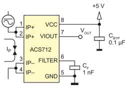 Obwód zawarty w układzie zapewnia na wyjściu napięcie proporcjonalne do natężenia płynącego prądu, a dokładniej 185 mV/A (typowo). Aplikacja tego układu jest niezwykle prosta, bowiem wymaga zaledwie dwóch kondensatorów o niewielkich pojemnościach – rysunek 3.
