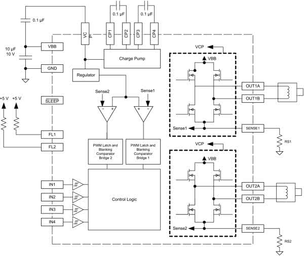 dla wartości R1A = R1B = 1 Ω, prąd uzwojeń wynosi ok. 0,4 A. Podczas doboru rezystorów ograniczenia należy spełnić warunek taki, aby napięcie na wyprowadzeniu SENSE nie przekraczało 0,5 V.