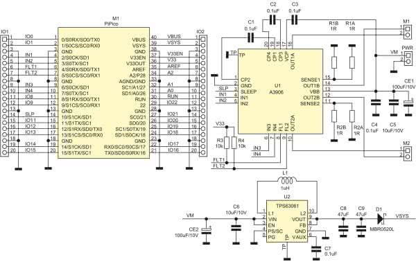 Dla sterowania driverem A3906 przeznaczono wyprowadzenia 2 i 3 oraz 6 i 7 ustalające kierunek obrotów lub prędkość silnika, jeżeli GPIO pracuje w trybie PWM, wyprowadzenie 10 ustawione w tryb wysoki aktywuje driver. Stan wyjść A3906 sygnalizujących przeciążenie drivera FLT1, FTL2 dostępny jest na wyprowadzeniach 4 i 5 płytki RPi Pico. Silniki podłączone są do złącz śrubowych M1, M2. Zasilanie VM 3,6...9 V doprowadzone jest do złącza PWR, należy pamiętać o odpowiedniej wydajności zasilacza i jego odpowiednim odsprzęganiu.