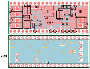 Moduł zmontowany jest na dwustronnej płytce drukowanej o wymiarach zgodnych z Raspberry Pi Pico, której schemat został pokazany na rysunku 3. Montaż jest typowy, należy tylko zwrócić uwagę na przylutowanie padów termicznych układów U1,U2, dla zapewnienia prawidłowego odprowadzania ciepła.