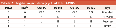 Moduł bazuje na podwójnym mostkowym driverze silników typu A3906, którego budowę pokazano na rysunku 1.