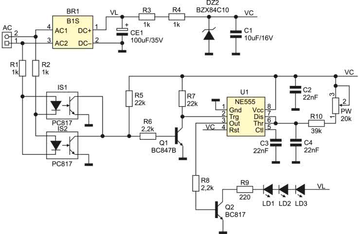 Schemat stroboskopu został pokazany na rysunku 1. Moduł zasilany jest napięciem przemiennym 16 V AC, które często jest stosowane do zasilania silników synchronicznych gramofonów. Jeżeli gramofon zasilany jest w inny sposób, stroboskop można zasilać też z niewielkiego transformatora 230 V/15 V AC o niewielkiej mocy, np. 0,5 VA. Napięcie zasilania doprowadzone jest do zacisków AC płytki, gdzie jest wyprostowane i stabilizowane służy do zasilania układu U1 typu NE555. Transoptory IS1, IS2 służą do generowania impulsów 100 Hz wyzwalających generator U1. Niewielka korekta szerokości impulsów potencjometrem PW pozwala na uzyskanie wyraźnego obrazu znaczników tarczy stroboskopowej niezależnie od kształtu nadruku. Tranzystor Q2 buforuje wyjście NE555.