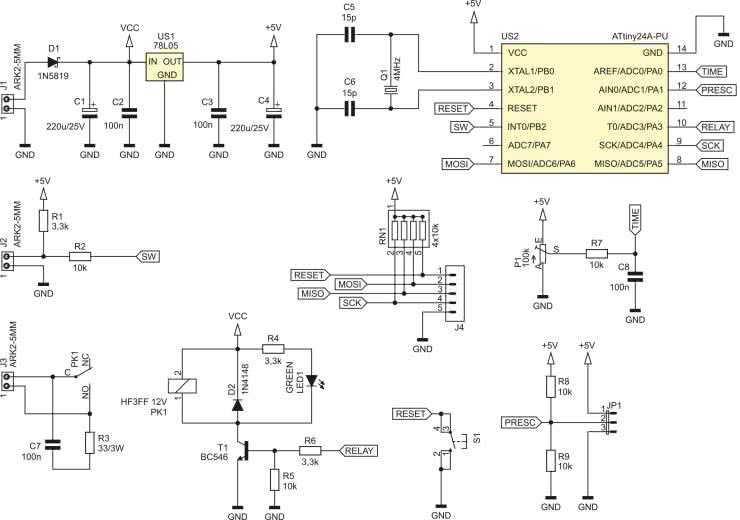 Potencjometrem P1 ustawiamy żądany czas zadziałania. Obracając go zgodnie z ruchem wskazówek zegara, czas zwiększamy, a przeciwnie, zmniejszamy – jak w typowym pokrętle regulacji głośności. Przy zdjętej zworce JP1 czas można regulować w zakresie do 204 s z krokiem 200 ms, co daje wrażenie niemal płynnej regulacji.
