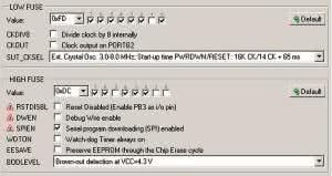 Szczegóły są widoczne na rysunku 3, który zawiera widok okna konfiguracji tychże bitów z programu BitBurner. W ten sposób zostanie uruchomiony generator dla rezonatora kwarcowego (o częstotliwości z przedziału 3…8 MHz) oraz Brown-Out Detector, który wprowadzi mikrokontroler w stan zerowania, jeżeli jego napięcie zasilające spadnie poniżej 4,3 V. To znacznie zmniejsza ryzyko zawieszenia się układu podczas uruchamiania.