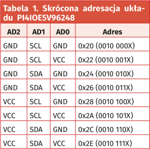 Schemat modułu został pokazany na rysunku 2. Oprócz układu U1 typu PI4IOE5V96248, w układzie zastosowano trzy zworki AD0...AD2 umożliwiające ustalenie adresu. Pełna adresacja U1 umożliwia zastosowanie do 64 układów na jednej magistrali. Skróconą adresację zaprezentowano w tabeli 1, pełna lista ze względu na objętość zamieszczona jest w dokumentacji dołączonej do materiałów dodatkowych.