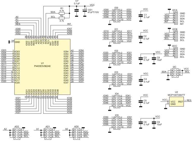 W układzie zastosowano układ PI4IOE5V96248 (Diodes/Pericom), który umożliwia rozbudowę aplikacji o sześć ośmiobitowych quasi-dwukierunkowych portów cyfrowych GPIO. Schemat wewnętrzny układu PI4IOE5V96248 został pokazany na rysunku 1.