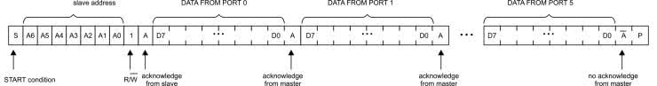 Odczyt stanu wejść na magistrali I²C odbywa się sekwencyjnie zgodnie z rysunkiem 3. Podobnie jak w PCF8574, po zmianach kierunku GPIO należy pamiętać o ustawieniu stanu wysokiego na odpowiadającym wyprowadzeniu przed odczytem jego stanu. Podobnie w przypadku wyjść, ustawienie portów odbywa się sekwencyjnie, zgodnie z rysunkiem 4.