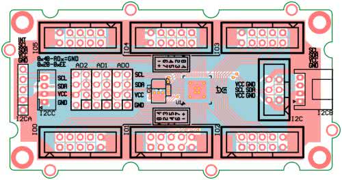 Sygnały sześciu portów GPIO wraz z zasilaniem doprowadzone są do złączy IO0...IO5. Magistrala I²C wyprowadzona jest na złącza I²CA...I²CC w standardzie SIP 2,54 mm, JST 2,00 mm i Grove. Dodatkowo na złącze I²CA i I²C wyprowadzono sygnał przerwania U1. Złącze I²C typu IDC6 może służyć do wygodnego kaskadowego łączenie modułów taśmą IDC 1:1. Układ U2 zapewnia poprawny restart układu po włączeniu zasilania.