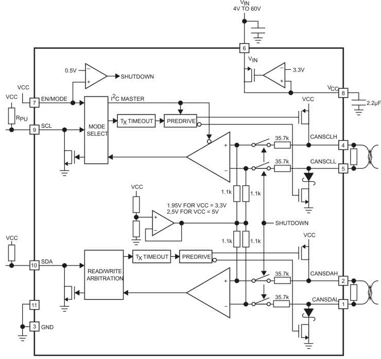 Minimoduł zawiera układ kontrolera I²C typu LTC3960 firmy Analog Devices, którego struktura wewnętrzna została pokazana na rysunku 1. Zawiera on dwa konwertery sygnałów SDA, SCL dopasowujące magistralę I²C do standardów warstwy fizycznej CAN, co pozwala na zwiększenie zasięgu i odporności na zakłócenia sygnałów I²C. Układ LTC3960 jest przezroczysty dla transmisji I²C, kompletny tor składa się z dwóch identycznych modułów, jednego skonfigurowanego jako Master, drugiego jako Slave, oba układy połączone są dwuparową skrętką zgodną z CAN (120 Ω).
