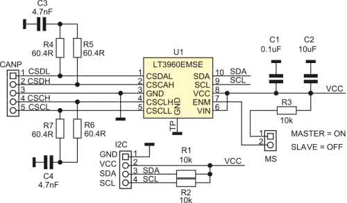 Schemat modułu został pokazany na rysunku 2. Jest podstawową aplikacją układu LTC3960 dla połączenia punkt-punkt. Zawiera dodatkowo terminatory magistrali – rezystory R4, R5 i kondensator C3 oraz R6, R7 i C4 dla każdego z sygnałów SDA, SCL. Zwora MS określa tryb pracy układu Master/Slave. Magistrala I²C oraz zasilanie 3,3/5 V dla modułu doprowadzone są poprzez złącze zgodne z Grove.