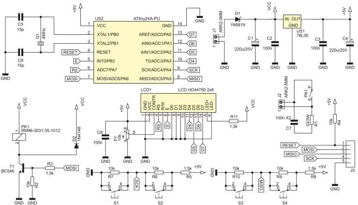 Schemat ideowy omawianego układu znajduje się na rysunku 1. Napięcie zasilające należy podłączyć do zacisków złącza J1. Jest ono filtrowane przez kondensator C1, zaś dioda D1 chroni układ przed uszkodzeniem w razie odwrotnego podłączenia źródła zasilania. Tym napięciem zasilane jest podświetlenie wyświetlacza LCD, cewka przekaźnika i prosty stabilizator liniowy US1 o napięciu wyjściowym 5 V. Kondensatory C2 i C3 zapobiegają jego wzbudzeniu, zapewniając stabilną pracę tego podzespołu.