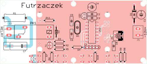 Układ został zmontowany na dwustronnej płytce drukowanej o wymiarach 115×50 mm, której schemat został pokazany na rysunku 2. W odległości 3 mm od krawędzi płytki znalazły się cztery otwory montażowe, każdy o średnicy 3,2 mm. Dodatkowo, aby płytka nie uginała się podczas naciskania przycisków, na środku dłuższego boku (67,5 mm od brzegu) umieszczono dodatkowe otwory, również leżące 3 mm od krawędzi.
