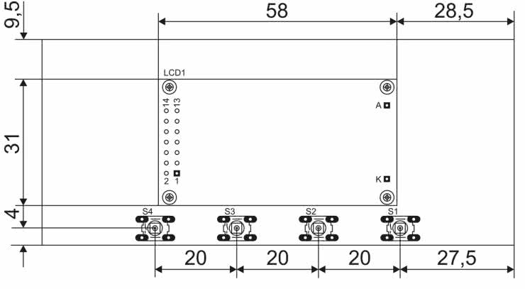 Na drugiej stronie płytki jest miejsce dla wyświetlacza LCD1 oraz czterech przycisków S1…S4. Ich lokalizację po przylutowaniu pokazuje fotografia tytułowa. Na samym końcu należy przykręcić wyświetlacz LCD za pomocą czterech tulei dystansowych oraz przylutować jego złącza. Warto lutowanie zostawić na sam koniec, po przykręceniu, aby ewentualny naddatek wysokości tulei mógł być skompensowany przez lekkie wystawanie złączy z powierzchni płytki – by część męska i żeńska wchodziły w siebie całkowicie. Rozmieszczenie przycisków oraz modułu wyświetlacza na powierzchni płytki znajduje się na rysunku 3, dzięki niemu łatwiej będzie wykonać płytę czołową obudowy dla tego urządzenia.