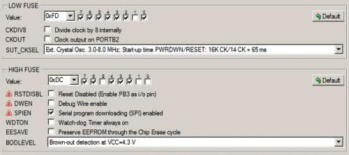 Szczegóły są widoczne na rysunku 4, który zawiera widok okna konfiguracji tychże bitów z programu BitBurner. W ten sposób zostanie uruchomiony generator dla rezonatora kwarcowego (o częstotliwości z przedziału 3…8 MHz) oraz Brown-Out Detector, który wprowadzi mikrokontroler w stan zerowania, jeżeli jego napięcie zasilające spadnie poniżej 4,3 V. To znacznie zmniejsza ryzyko zawieszenia się układu podczas uruchamiania.