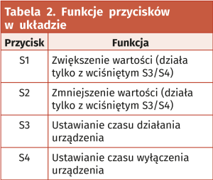 Mając świeżo zaprogramowany mikrokontroler, układ przyjmuje najniższe możliwe wartości czasów pracy i wyłączenia urządzenia. Są to, odpowiednio, 1 minuta i 1 sekunda. Użytkownik ma do wyboru po 16 różnych wartości, które może ustawiać oddzielnie. Zostały one zebrane w tabeli 1.