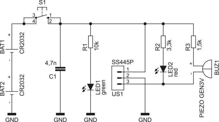 Układ jest zasilany z dwóch połączonych szeregowo baterii typu CR2032. Napięcie zasilające jest dołączane za pośrednictwem monostabilnego przycisku S1, co sygnalizuje załączenie diody LED1. W ten sposób układ pobiera prąd z baterii tylko wtedy, kiedy jest używany – trzymając go w dłoni, trzymamy wciśnięty przycisk i „obwąchujemy” wystającym z płytki czujnikiem US1 wszystkie podejrzane przekaźniki.