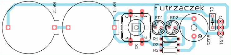 Układ został zmontowany na jednostronnej płytce drukowanej o wymiarach 24×100 mm, której schemat został pokazany na rysunku 3. Nie zostały przewidziane otwory montażowe, ponieważ płytka będzie trzymana w dłoni.