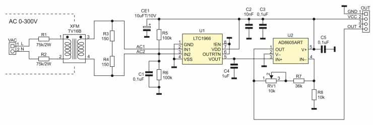 Zakres pomiaru napięcia 0...300 V jest przeskalowany na napięcie wyjściowe 0...3,00 V, zapewniając dokładność przetwarzania i niewielki margines zasilania.