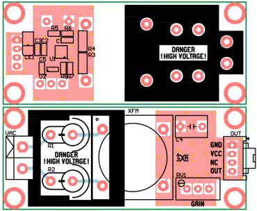 Układ wykonany jest na dwustronnej płytce drukowanej, której schemat został pokazany na rysunku 2. Montaż układu nie wymaga opisu, zmontowany moduł jest widoczny na fotografii tytułowej.