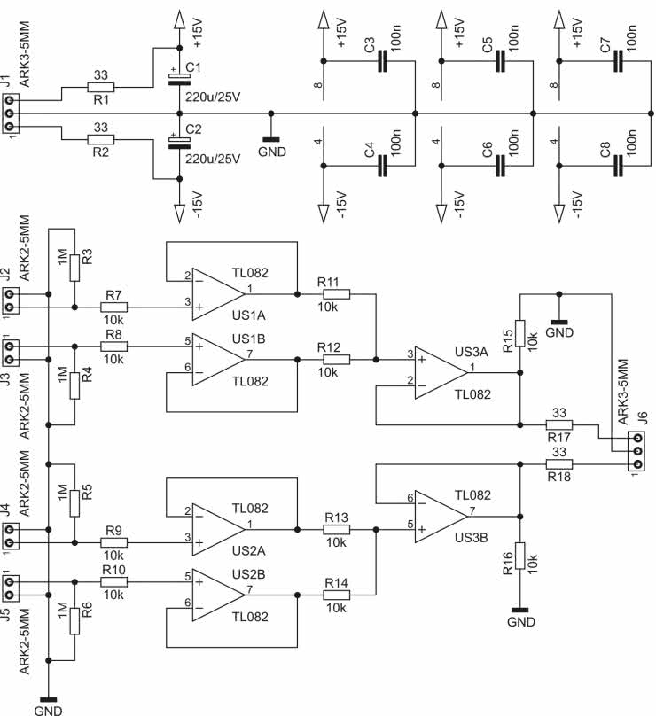 Rezystory R3…R6 o rezystancji 1 MΩ polaryzują wejścia wzmacniaczy operacyjnych, stanowiąc przy tym bardzo małe obciążenie dla źródeł sygnału. Ponieważ układy typu TL082 mają obwody wejściowe z tranzystorami FET, nie trzeba przejmować się problemem wyrównywania rezystancji widzianej przez wejścia wzmacniaczy operacyjnych, gdyż prąd przez nie pobierany jest rzędu nanoamperów, a rezystancja wejściowa wynosi wiele gigaomów.