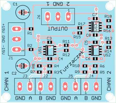 Złącza J2 i J3 służą do podania dwóch sygnałów wejściowych, które pojawia się jako suma w kanale 1 na wyjściu, którym jest złącze J6. Z kolei sygnały ze złączy J4 i J5 zostaną zsumowane jako wyjściowy kanał 2. Wszystkie zaciski GND na płytce są połączone ze sobą polem miedzi na spodniej stronie płytki – służy ono jako ekran dla zakłóceń elektromagnetycznych.