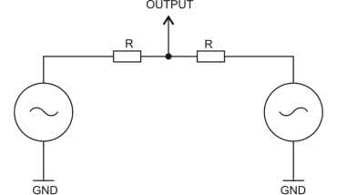 Kiedy na jedno wejście trzeba podać sygnał z więcej niż jednego źródła, należy sygnały z tych źródeł poddać operacji sumowania. W teorii to nie jest nic trudnego – spójrzmy na rysunek 1 – wystarczą dwa rezystory. Ale praktyka dowodzi inaczej. Po pierwsze, te źródła mogą mieć różną (najczęściej większą od zera) impedancję wyjściową. Ulegnie ona zsumowaniu z rezystancją opornika ograniczającego prąd wyjściowy danego źródła i spowoduje, że będzie ono brane z mniejszą wagą, tj. w wynikowym sygnale jego udział będzie mniejszy. O ile mniejszy? Tego najczęściej nie wiemy, zwłaszcza kiedy impedancja zależy od częstotliwości. Druga rzecz: impedancja wyjściowa tego tworu wynosi R/2, co w wielu przypadkach może być przyczyną silnego tłumienia już zsumowanego sygnału.