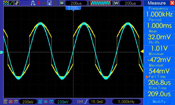 Przykładowy efekt działania tego układu można zobaczyć na rysunku 4. Na jedno wejście podano sygnał sinusoidalny o amplitudzie 500 mV i częstotliwości 1 kHz, a na drugie sygnał prostokątny (bez składowej stałej) o wypełnieniu 50% i identycznej amplitudzie oraz częstotliwości. Uzyskana suma ma wartość międzyszczytową 500 mV i składa się z obu sygnałów wziętych w identycznych stosunkach.