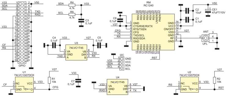 Schemat nakładki został pokazany na rysunku 1. Modem korzysta z portu szeregowego Raspberry Pi. Po konwersji poziomów 2,7/3,3 V w układach U3, U4, sygnały TX/RX doprowadzone są do modemu RM. Modem zasilany jest z V50 (+5 V), zapewnia to pełną moc nadajnika, napięcie jest dodatkowo odfiltrowane przez elementy C1, C2, CE1. Napięcie V27 z wewnętrznego stabilizatora LDO umieszczonego w RM zasila konwertery poziomów U3, U4 po stronie modemu. Sygnał RF doprowadzony jest go gniazda ANT typu uFL.