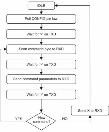 Konfiguracja modemu może być przechowywana w pamięci ulotnej RAM, może być też zapisana w pamięci nieulotnej NVM. Należy pamiętać o ograniczonej liczbie cykli zapisu pamięci NVM (ok. 10000) i ograniczyć zapisy do niezbędnego minimum. Dane zapisane w NVM są przywracane po resecie modemu. Wyjście z trybu konfiguracji wymaga zmiany stanu CFG na 1 oraz wydania komendy X (Exit), która nie zostanie już potwierdzona. Przykład odczytu zawartości pamięci w trybie konfiguracji poleceniem „0” pokazano na rysunku 4.