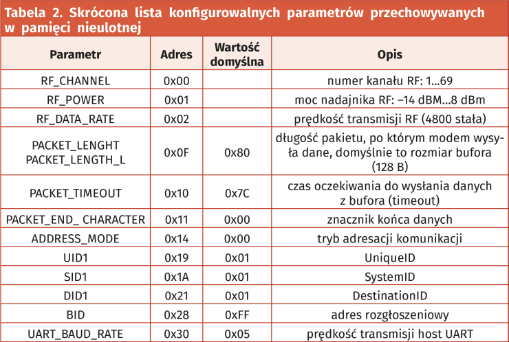W tabeli 2 zamieszczono skróconą listę konfigurowalnych parametrów przechowywanych w pamięci nieulotnej. Wartości te mogą być zmieniane za pomocą komendy „M”. Wszystkie adresy i argumenty muszą być wysyłane do modułu jako wartości binarne.