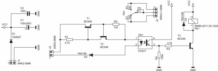 Obwód zasilający cewkę przekaźnika PK1 jest zabezpieczony diodą D1, która zatka się w przypadku wystąpienia nieprawidłowej polaryzacji napięcia przyłożonego do zacisków złącza J1. Kondensatory C1 i C2 stanowią podręczny magazyn energii dla przełączającej się cewki.