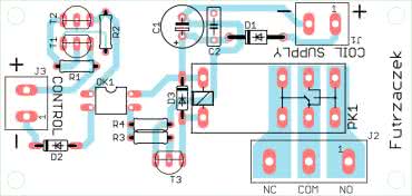 W odległości 3 mm od krawędzi płytki znalazły się cztery otwory montażowe, każdy o średnicy 3,2 mm. Montaż proponuję rozpocząć od elementów o najmniejszej wysokości obudowy, czyli rezystorów i diod. Ścieżki łączące styki przekaźnika z zaciskami złącza J2 zostały odsłonięte spod maski lutowniczej i można je pogrubić spoiwem lutowniczym.