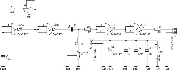 Schemat ideowy omawianego układu znajduje się na rysunku 1. Zawiera cztery bramki NAND typu 74AC132. Podzespoły te mają wejścia wyposażone w przerzutniki Schmitta. Pierwsza taka bramka, US1A, wytwarza sygnał prostokątny o wypełnieniu około 50% i częstotliwości regulowanej przy pomocy potencjometru P1.
