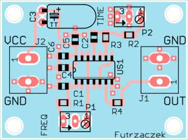 Układ został zmontowany na niewielkiej, dwustronnej płytce drukowanej o wymiarach 30×40 mm, której schemat został pokazany na rysunku 3.