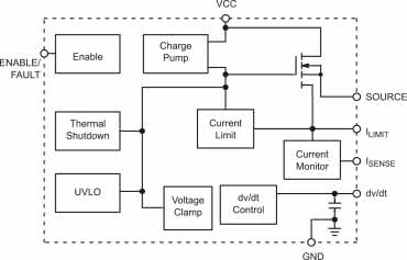 Na wyjściu IS, dostępny jest sygnał prądowy monitorujący aktualny pobór prądu obciążenia, dla rezystora R2=1 kΩ, współczynnik przetwarzania to 1 mA/A. Układ ma zabezpieczenie termiczne działające po przekroczeniu temperatury 175°C.