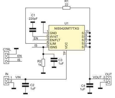 apięcie zasilające doprowadzone jest do złącza IN, napięcie wyjściowe dostępne jest na złączu OUT. Wartość ograniczenia prądowego ustalana jest rezystorem R1 zgodnie z charakterystyką pokazaną na rysunku 4. Maksymalny prąd układu NIS5420MT7 wynosi 2,1 A (R1=20 Ω), charakterystyka zabezpieczenia jest automatyczna, po ustaniu przeciążenia układ ponownie załączy napięcie na wyjściu.