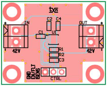Układ zmontowany jest na miniaturowej dwustronnej płytce drukowanej, której schemat pokazano na rysunku 5. Przed montażem należy ewentualnie skorygować wartości elementów zgodnie z wymogami aplikacji. Montaż układu jest typowy i nie wymaga opisu, należy tylko poprawnie przylutować pad termiczny układu U1.